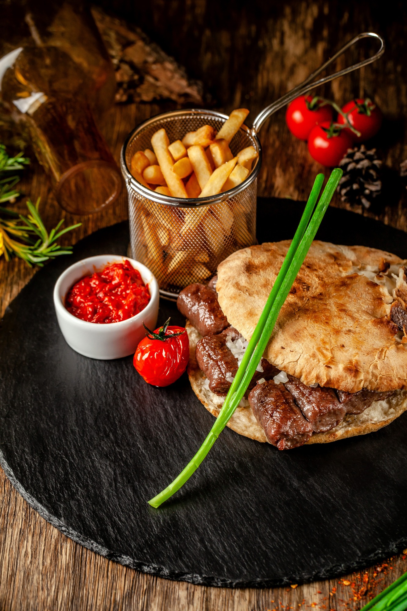 (mäso,hranolky, šalát, parad.uhorka, kukurica, cibuľa,olivy, dresing) 7 -